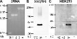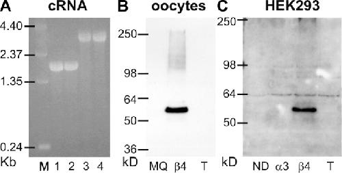 Figure 4. . cRNA gel-electrophoresis (A) and Western blots of expressed proteins in oocytes (B) and HEK293 cells (C). Approximately 1 μg of α3 (1), β4 (2), α3_β4 tandem (3), and β4_α3 tandem (4) besides the RNA ladder (M) were separated on a 1.5% agarose-gel (A). The Western blot in B was obtained from oocytes injected with water only (MQ), β4 only, or β4_α3 tandem (T) and the Western blot in C from HEK293 cells transfected with no DNA (ND), α3 only, β4 only, or β4_α3 tandem (T). Detection by β4 antibody and visualization by chemoluminescence. Bands for the β4 subunit were detected at the expected size of 56 kD for both blots after 30-s exposure. No breakdown products were observed for the tandem constructs in either blots, even for longer exposures up to 1 h. Note that the tandem fusion protein (predicted size of 115 kD) was not detected by the β4 antibody used (see text).