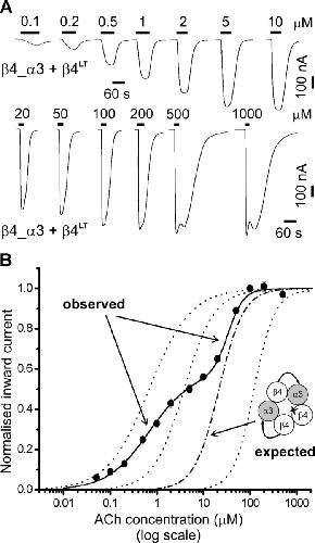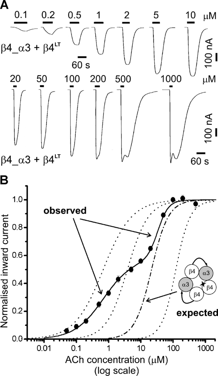 Figure 7. . Inserting the L9′T reporter mutation in the β4monomer subunit of linked subunit nAChRs reveals multiple receptor populations. (A) Examples of inward currents elicited by bath-applied ACh in oocytes expressing β4_α3 + β4LT. (B) Concentration-response curve for oocytes injected with β4_α3 + β4LT cRNAs (filled circles, n = 4). Data were normalized and pooled as described in materials and methods and in the legend to Fig. 2. In this case the initial fit was a simultaneous fit of a two-component Hill equation to each dose–response curve, with the constraint of equal EC50 and Hill slope across oocytes (the proportion of the first component was allowed to vary). The three dotted curves shown for reference are, respectively (right to left), the concentration-response curve for receptors with no mutations (β4_α3 + β4), two mutation copies (β4_α3LT + β4), or three mutation copies (β4LT_α3 + β4LT). The dashed curve shows the concentration-response curve expected for complete tandem incorporation as depicted in the cartoon (i.e., one mutation copy).