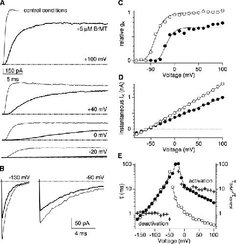 Figure 2. . Effects of 5 μM BrMT applied externally to ShBΔ channels. Data in all panels are from the same outside-out patch. (A) IK activation during voltage steps from −100 mV to a series of voltages. Thin traces: control condition. Thick traces: 5 μM BrMT. (B) IK deactivation after activating pulses to +20 mV. (C) Conductance-voltage relations from tail currents determined in the absence and presence of BrMT. Lines are fits of a fourth-power of a Boltzmann function (control: V1/2 = −59, z = 2.1; 5 μM BrMT: V1/2 = −3.4, z = 2.5). (D) BrMT does not affect rectification or reversal potential. Instantaneous I-V plot was constructed from tail current amplitudes after an activating pulse to +20 mV. Open circles: control condition. Filled circles: 5 μM BrMT. Lines are linear fits to the data. Reversal potentials from these fits are −58.2 mV (control) and −58.1 mV (BrMT). (E) Voltage dependence of activation and deactivation kinetics in the absence and presence of BrMT. Activation time constants were determined by a single exponential fit to the final 50% of the IK waveform. Deactivation time constants were determined by a single exponential fit to the entire decay of IK after an activating pulse to +20 mV. Open circles: τcontrol, control condition. Filled circles: τBrMT, 5 μM BrMT. Crosses: τBrMT/τcontrol.