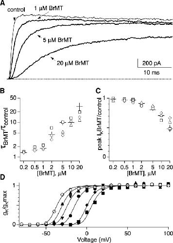 Figure 3. . Concentration dependence of external BrMT. Doseâresponse data from outside-out patches containing ShBÎ. (A) Thin trace: ShBÎ IK in response to a voltage step from â100 to +40 mV. Thick traces: IK at +40 mV in BrMT. (B) Slowing of IK activation by BrMT at +40 mV is plotted as the ratio of time constants from fits to activation kinetics (ÏBrMT/Ïcontrol). Different symbols represent values from different patches that underwent the entire doseâresponse. Crosses represent mean ± SE from 4â9 patches. (C) Effect of BrMT on peak IK amplitude. Peak IK was measured at +40 mV. Symbols correspond to same patches as in B. Crosses represent mean ± SE from 4â10 patches. (D) Conductance-voltage relations determined from different concentrations of BrMT applied to a single patch. Conductance values are from tail currents at â100 mV. Data at each concentration were normalized to the peak amplitude of a fourth-power Boltzmann fit (lines). Fits to BrMT data were constrained to have the steepness of the fit to control data (z = 3.4). V1/2 values from the fourth-power fits: control (open circles) = â49 mV; 1 μM (triangles) = â42 mV; 2 μM (inverted triangles) = â36 mV; 5 μM (filled circles) = â27 mV; 10 μM (diamonds) = â12 mV; 20 μM (squares) = â6 mV.
