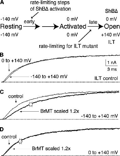 Figure 6. . BrMT slows early but not late activating transitions of ShBΔ ILT. IK from ShBΔ V369I;I372L;S376T (ILT) in outside-out patches. HP = −60. Pipette solution did not contain TCEP. (A) Scheme depicting gating of ILT channels. (B) IK rise from ILT channels at +140 mV after 60-ms prepulses to either −140 or 0 mV. Note the slight delay apparent from −140 mV. (C) ILT activation during a step from −140 mV. IK in 5 μM BrMT is scaled to match peak control IK. Open circle: mean time to half maximal IK in 5 μM BrMT was 1.6 ± 0.2 times that of control, n = 5 patches. (D) ILT activation during a step from 0 mV. IK in 5 μM BrMT is scaled to match peak control IK. Note the near perfect IK overlay indicating that BrMT does not slow the late activation steps of the ILT channel. Open circle: mean time to half maximal IK in 5 μM BrMT was similar (1.1 ± 0.1 times control, n = 5 patches).
