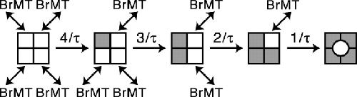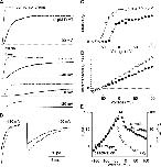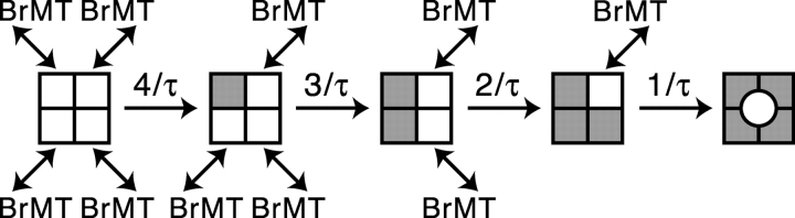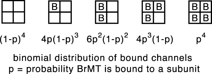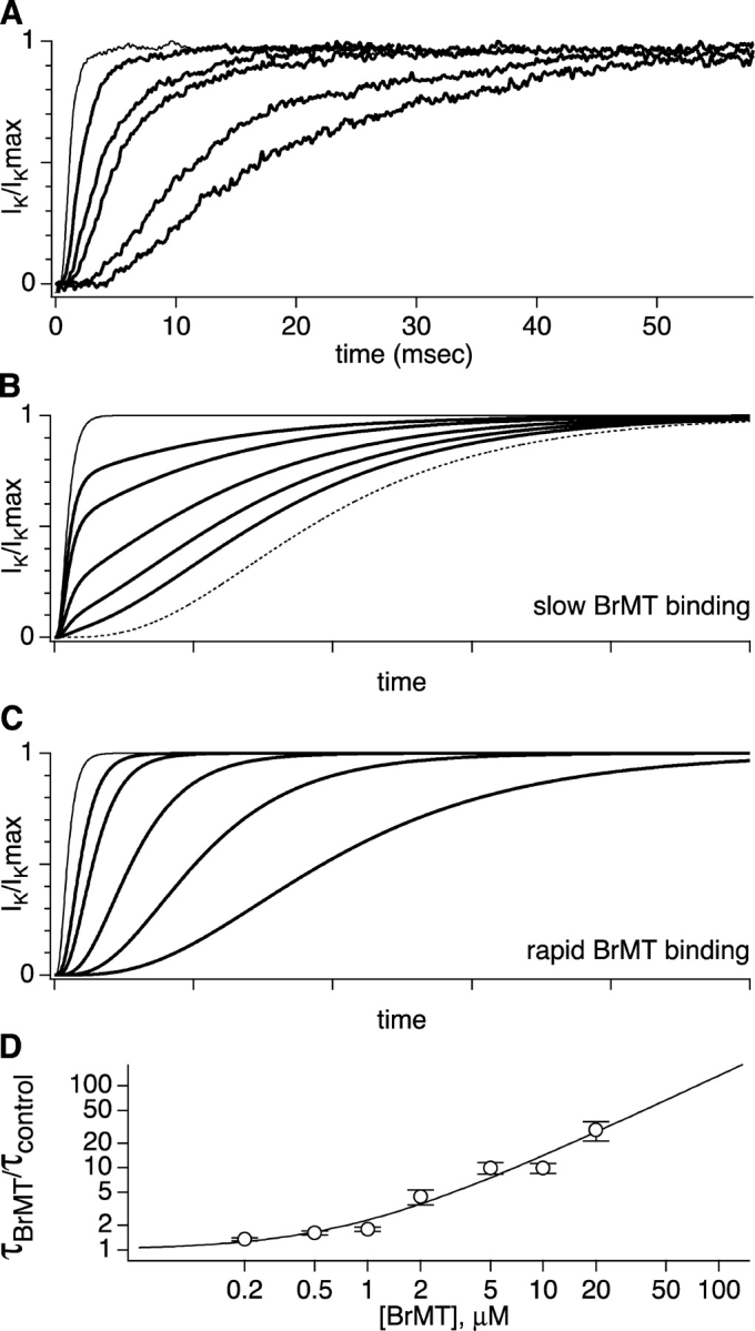 Figure 7. . Graded activation slowing can be modeled by rapid, reversible binding of BrMT to resting voltage sensors. (A) ShBΔ IK scaled to match peak current amplitudes. Thin trace: voltage step from −100 to +40 mV under control conditions. Thick traces: progressive slowing of activation at +40 mV by 1, 2, 5, 10, and 20 μM BrMT. (B) Predicted IK from an activation model with slow BrMT binding to each of four subunits that undergo a single activating transition. Subunits bound to BrMT activate 20-fold slower than those without. This value was chosen because the maximal slowing of ShBΔ activation seen was ∼20-fold in BrMT versus control (see D). The proportion of channels with 0, 1, 2, 3, or 4 BrMT bound was binomial. Thin line: control condition. Dotted line: saturating BrMT. Thick lines: [BrMT] = 0.2, 0.5, 1, 2, and 5× KD. (C) Predicted IK from Eq. 4. This equation represents an n4 model of activation with rapid BrMT binding as in Scheme IV. Increasing the concentration of BrMT slows activation by increasing the proportion of time subunits are bound to BrMT and thus unable to activate. Thin line: control condition. Thick lines: [BrMT] = 1, 2, 5, 10, and 20× KD. (D) Filled circles: ratio of τBrMT and τcontrol at +40 mV, n = 4–9. Line: fit of rapid binding model (Eq. 3) to data. KD from fit = 0.8 μM.