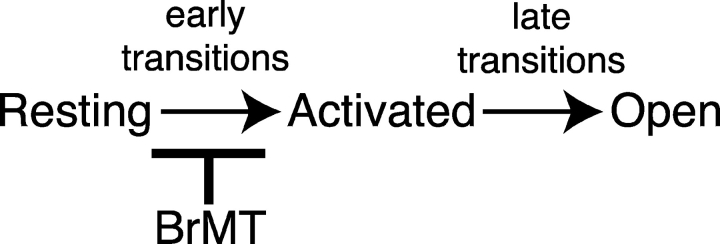 A toxin from a marine gastropod's defensive mucus, a disulfide-linked dimer of 6-bromo-2-mercaptotryptamine (BrMT), was found to inhibit voltage-gated potassium channels by a novel mechanism. Voltage-clamp experiments with Shaker K channels reveal that externally applied BrMT slows channel opening but not closing. BrMT slows K channel activation in a graded fashion: channels activate progressively slower as the concentration of BrMT is increased. Analysis of single-channel activity indicates that once a channel opens, the unitary conductance and bursting behavior are essentially normal in BrMT. Paralleling its effects against channel opening, BrMT greatly slows the kinetics of ON, but not OFF, gating currents. BrMT was found to slow early activation transitions but not the final opening transition of the Shaker ILT mutant, and can be used to pharmacologically distinguish early from late gating steps. This novel toxin thus inhibits activation of Shaker K channels by specifically slowing early movement of their voltage sensors, thereby hindering channel opening. A model of BrMT action is developed that suggests BrMT rapidly binds to and stabilizes resting channel conformations.