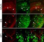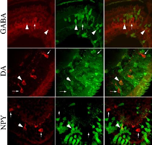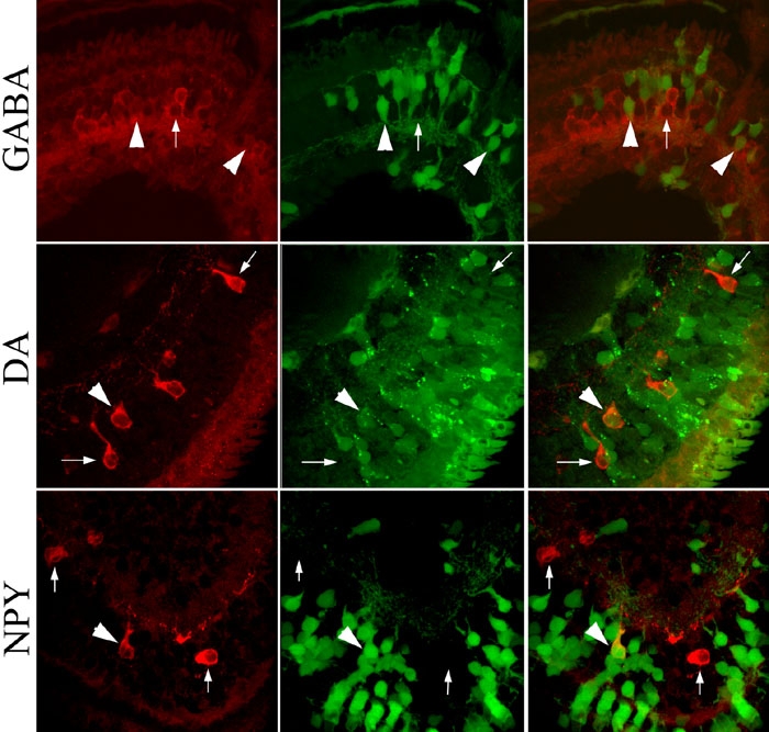 Figure 2. Labeling of amacrine cell subtypes. Sections of retina were labeled with antibodies to distinguish amacrine subtypes (red cells); those descended from the injected blastomere express GFP (green cells). Top row: Large numbers of amacrine cells express GABA (left panel). Large arrowheads indicate two GABA amacrine cells descended from D1.1.1 blastomere (green in middle panel and double-labeled in merged right panel). Small arrow indicates a GABA amacrine cell that is not GFP-labeled. Middle row: Dopamine (DA) amacrine cells are less abundant (left panel). Large arrowhead indicates a DA amacrine cell descended from D1.1.1 blastomere (green in middle panel and double-labeled in merged right panel). Small arrows indicate two DA amacrine cells that are not GFP-labeled. Bottom row: NPY amacrine cells also are less abundant (left panel). Large arrowhead indicates a NPY amacrine cell descended from D1.1.1 blastomere (green in middle panel and double-labeled in merged right panel). Small arrows indicate two NPY amacrine cells that are not GFP-labeled. Each image was collected with 40x oil lens, zoom set at 1.9, in a 1024x1024 pixel field, and pixel size equal to 0.12 μm.