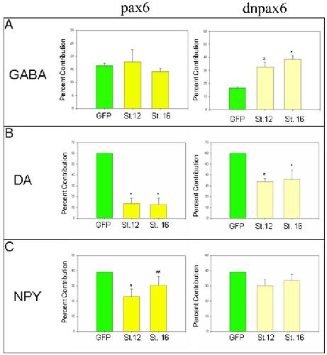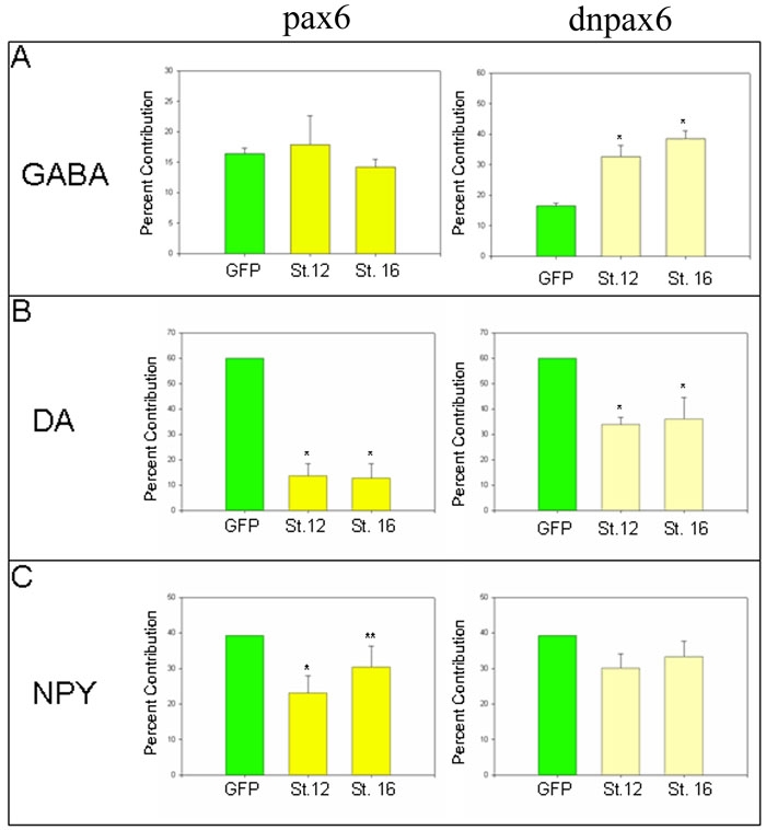 Figure 4. Altered Pax6 levels/activity differentially affect amacrine cell subtypes. pax6 gain-of-function (dark yellow bars) and loss-of-function (dnpax6, light yellow bars) were induced at early (St. 12) and late (St. 16) eye field stages, and analyzed as in Figure 3. pax6 gain-of-function at either eye field stage significantly reduced the D1.1.1 contribution to DA amacrine cells, whereas it only affected NPY cells at stage 12. pax6 loss-of-function at both stages significantly increased GABA cells and significantly decreased DA cells. NPY amacrine cells were not significantly affected by pax6 loss-of-function at either stage.