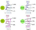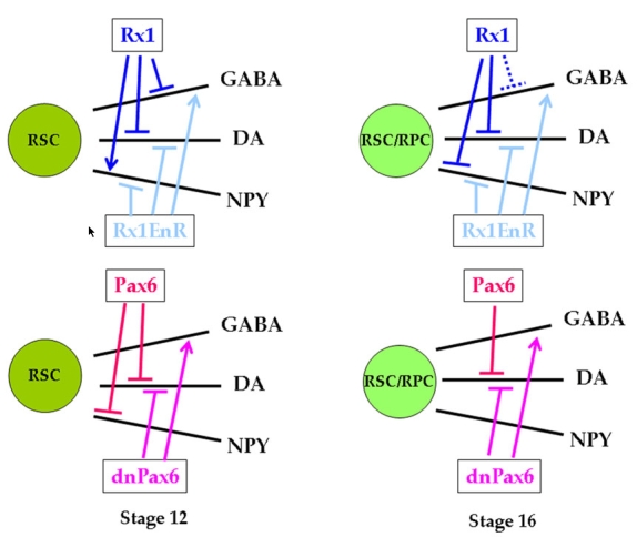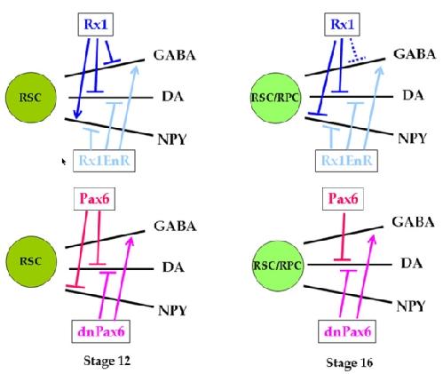 Figure 5. The developmental programs that produce amacrine cell subtypes are differentially affected by Rx1 and Pax6 in a time-dependent manner. The effects on the number of amacrine cells produced after induction of the different Rx1 and Pax6 constructs at the two eye field stages are summarized. Retinal stem cells (RSC) in the stage 12 eye field are repressed by Rx1 from producing GABA and DA amacrine cells, but Rx1 is required for NPY amacrine cells. In contrast, Pax6 represses the production of DA and NPY amacrine cells. Loss-of-function of either Rx1 (by Rx1EnR) or Pax6 (by dnPax6) is required for GABA amacrine cell production. In the stage 16 eye field, which is likely comprised of both RSC and retinal progenitor cells (RPC) [22], Rx1 continues to repress DA amacrine cells, but the effect on GABA amacrine cells is much reduced. In addition, Rx1 now represses NPY amacrine cells. Pax6 continues to repress DA cells, but the effect on NPY cells is no longer detectable. As at stage 12, loss-of-function of either Rx1 (by Rx1EnR) or Pax6 (by dnPax6) is required for GABA amacrine cell production. These data indicate that Rx1 and Pax6 differentially affect the production of the different amacrine subtypes over time. Because both genes are considered to be transcriptional activators [28,43], their inhibitory effects on amacrine subtypes are likely to be transcriptionally indirect.