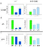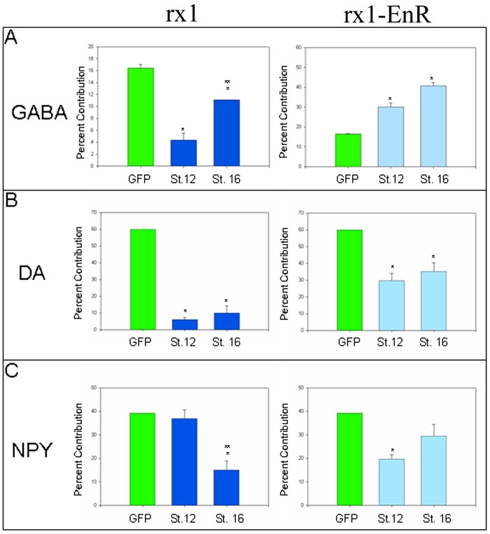 Figure 3. Altered Rx1 levels/activity affect all three amacrine cell subtypes. rx1 gain-of-function (dark blue bars) and loss-of function (rx1-EnR; light blue bars) were induced at early (St. 12) or late (St. 16) eye field stages. The percent contribution that the injected blastomere lineage made to the total number of the subtype was determined for: (A) GABA, (B) DA and (C) NPY amacrine cells. Bars indicate SEM. A single asterisk (*) indicates a significant difference (p<0.05) compared to gfp mRNA-injected control embryos that also were treated with dexamethasone (green bars). A double asterisk (**) over a stage 16 bar indicates a significant difference (p<0.05) compared to stage 12 induction data. All samples passed the equal variance test. rx1 gain-of-function at both eye field stages caused a significant reduction of GABA and DA amacrine cells, but the GABA reduction was significantly less at stage 16. In contrast, NPY amacrine cells were reduced only at the late stage. rx1 loss-of-function increased GABA cell production and reduced DA amacrine cell production equivalently at both eye field stages; it significantly decreased NPY amacrine cells only at stage 12.