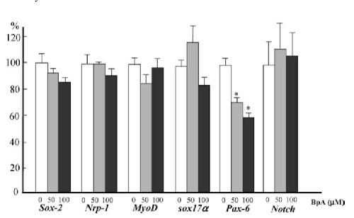 Bisphenol A (BpA) is widely used in industry and dentistry. Its effects on the embryonic development of Xenopus laevis were investigated. Xenopus embryos at stage 10.5 were treated with BpA. Developmental abnormalities were observed at stage 35; malformation of the head region including eyes and scoliosis. The expression of several markers of embryonic development was investigated by reverse transcription-polymerase chain reaction (RT-PCR). The pan-neural marker SOX-2, the neural stem cell marker nrp-1, the mesodermal marker MyoD, and the endodermal marker sox17alpha, were used. Although the expression of marker genes was not changed by treatment with BpA, that of Pax-6, a key regulator of the morphogenesis of the eyes, was decreased by BpA. Pax-6 is a downstream factor of Notch signaling. So, the expression of a typical Notch-dependent factor, ESR-1, was investigated in the presence of BpA. The expression of ESR-1 was efficiently suppressed by BpA. In whole mount in situ hybridization (WISH), Pax-6 was expressed in the central nervous system and eyes. The expression was lost completely on treatment with BpA. The expression of ESR-1 in the central nervous system and eyes also disappeared with BpA treatment. Injection of the intracellular domain of Notch efficiently recovered ESR-1 expression in the presence of BpA although injection of a ligand for notch, Delta, did not. These results suggest that BpA decreased the expression of ESR-1 by disrupting the Notch signal.