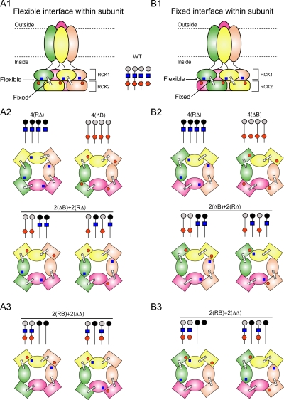 The activation of BK channels by Ca(2+) is highly cooperative, with small changes in intracellular Ca(2+) concentration having large effects on open probability (Po). Here we examine the mechanism of cooperative activation of BK channels by Ca(2+). Each of the four subunits of BK channels has a large intracellular COOH terminus with two different high-affinity Ca(2+) sensors: an RCK1 sensor (D362/D367) located on the RCK1 (regulator of conductance of K(+)) domain and a Ca-bowl sensor located on or after the RCK2 domain. To determine interactions among these Ca(2+) sensors, we examine channels with eight different configurations of functional high-affinity Ca(2+) sensors on the four subunits. We find that the RCK1 sensor and Ca bowl contribute about equally to Ca(2+) activation of the channel when there is only one high-affinity Ca(2+) sensor per subunit. We also find that an RCK1 sensor and a Ca bowl on the same subunit are much more effective in increasing Po than when they are on different subunits, indicating positive intrasubunit cooperativity. If it is assumed that BK channels have a gating ring similar to MthK channels with alternating RCK1 and RCK2 domains and that the Ca(2+) sensors act at the flexible (rather than fixed) interfaces between RCK domains, then a comparison of the distribution of Ca(2+) sensors with the observed responses suggest that the interface between RCK1 and RCK2 domains on the same subunit is flexible. On this basis, intrasubunit cooperativity arises because two high-affinity Ca(2+) sensors acting across a flexible interface are more effective in opening the channel than when acting at separate interfaces. An allosteric model incorporating intrasubunit cooperativity nested within intersubunit cooperativity could approximate the Po vs. Ca(2+) response for eight possible subunit configurations of the high-affinity Ca(2+) sensors as well as for three additional configurations from a previous study.