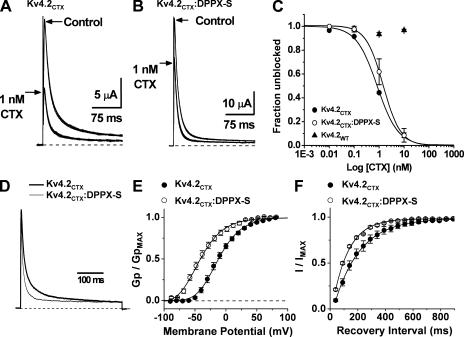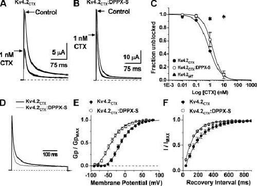 Figure 1. CTX sensitivity of Kv4.2 wild-type and Kv4.2CTX channels expressed in Xenopus oocytes. (A and B) Outward whole-oocyte K+ currents mediated by Kv4.2CTX and Kv4.2CTX:DPPX-S channels before (control saline in the bath) and after exposure to 1 nM CTX in control saline (see Materials and methods). Currents were elicited by 400-ms step depolarizations from â100 mV to +50 mV. (C) Doseâresponse relationships for Kv4.2WT, Kv4.2CTX, and Kv4.2CTX:DPPX-S channels. Both Kv4.2CTX and Kv4.2CTX:DPPX-S channels are sensitive to CTX in the subnanomolar or nanomolar range. The solid line superimposed on the symbols is the best-fit Hill equation of this form: y = (A2 + (A1 â A2))/ (1 + (x/Kd)h). A1 and A2 represent the maximum and minimum, Kd represents the apparent disassociation constant, and h represents the Hill coefficient. The best-fit parameters were as follows: Kv4.2CTX, Kd = 0.83 nM and h = 1.04; and Kv4.2CTX:DPPX-S, Kd = 1.48 nM and h = 1.27 (n ⥠3 experiments). DPPX-S does not significantly alter the CTX sensitivity of Kv.2CTX channels (P > 0.05 by one-way ANOVA). Data are expressed as mean ± SE. (D) Whole-cell (tsA201; see Materials and methods) Kv4.2CTX currents evoked by a 400-ms step depolarization to +32 mV from a holding potential of â108 mV. Note that the macroscopic inactivation of Kv4.2CTX channels is accelerated by DPPX-S. (E) Gp-V relationships of Kv4.2CTX channels expressed alone or coexpressed with DPPX-S. The solid lines are best-fit fourth-order Boltzmann functions with the following parameters: V1/2 (Kv4.2CTX) = â13.2 mV, k (Kv4.2CTX) = 23.2 mV; and V1/2 (Kv4.2CTX:DPPX-S) = â43.6 mV, k (Kv4.2CTX:DPPX) = 23.6 mV. The dashed line indicates the zero-conductance level. (F) Recovery from inactivation at â110 mV. The solid lines are the best-fit exponential functions with the following parameters: Ï (Kv4.2CTX) = 186 ms; and Ï (Kv4.2CTX:DPPX-S) = 116 ms. The changes induced by DPPX-S are similar to those reported by others for Kv4.2 wild type (Nadal et al., 2003; Jerng et al., 2004b). Data in E and F are expressed as mean ± SE.