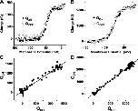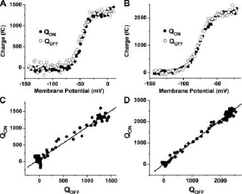 Figure 3. Charge conservation in Kv4.2CTX and Kv4.2CTX:DPPX-S channels. (A) QON-V and QOFF-V relationships from Kv4.2CTX channels. (B) QON-V and QOFF-V relationships from Kv4.2CTX:DPPX-S channels. (C) QON and QOFF values from Kv4.2CTX channels are strongly correlated with a slope of 0.97 (r = 0.98). (D) QON and QOFF values from Kv4.2CTX:DPPX-S channels are strongly correlated with a slope of 1.03 (r = 0.99).