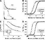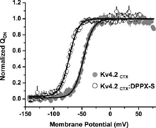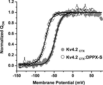 Figure 4. Normalized QON-V relationships from Kv4.2CTX and Kv4.2CTX:DPPX-S channels. The QON-V relationships were described by assuming a Boltzmann function (see Materials and methods) with the following best-fit parameters (Table I): V1/2 (Kv4.2CTX) = â47 mV and z (Kv4.2CTX) = 2.98 e0 (n = 6); and V1/2 (Kv4.2CTX:DPPX-S) = â73 mV and z (Kv4.2CTX:DPPX-S) = 3.04 e0 (n = 7). Current traces were sampled in 2-mV increments. The mean Qmax values in the absence and presence of DPPX-S were 107 ± 28 fC/pF (n = 6) and 98 ± 21 fC/pF (n = 7), respectively. Data are expressed as mean ± SE.