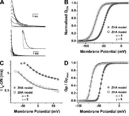 Figure 6. Kinetic modeling of voltage-dependent gating in the absence and presence of DPPX-S. All simulations assume the ZHA model of Kv channel gating and were conducted as described in Materials and methods. (A) Simulated Ig evoked by 6-ms step depolarizations (top, −55 to +65 mV; bottom, −75 to +65 mV; both in 20-mV increments) to the indicated membrane potentials and assuming a holding potential of −153 mV. The top and bottom families of traces simulate Kv4.2 Ig in the absence and presence of DPPX-S, respectively. The simulation parameters are those reported in Table I of Zagotta et al. (1994), except that for the bottom family of traces, the forward rate constants (α and δ) of the two sequential transitions in each subunit of the channel were increased fivefold. The inset compares control (continuous line) and accelerated (dashed line) Ig evoked by depolarizations to +45 mV. In all plots (B–D), the simulations that assume accelerated gating are depicted by open symbols. (B) Simulated QON-V relationships. QON was simulated in 2-mV increments. The continuous lines superimposed on the simulated data symbols are best-fit Boltzmann functions (see Materials and methods) with the following parameters: V1/2 (closed symbols) = −48 mV and z (closed symbols) = 3.2 e0; and V1/2 (open symbols) = −73 mV and z (open symbols) = 3.2 e0. The ΔV1/2 = −25 mV. (C) Simulated time constant–voltage relationships. The time constants were derived by approximating the simulated Ig relaxations with an exponential function (as done for the observed Ig; see Results). The initial fast phase at low voltages and the rising phase at high voltages were excluded from this analysis. The continuous lines superimposed on the simulated data symbols are best-fit exponential functions that describe the voltage dependence of the time constants (see Materials and methods). The effective valences derived from this analysis were 1.08 e0 (closed symbols) and 1.09 (open symbols) e0. (D) Simulated G-V relationships. The plots were generated from the steady-state level of the simulated ionic currents at the indicated membrane potentials (2-mV increments). The chord conductance (G) was calculated by assuming a reversal potential of −100 mV. The continuous lines superimposed on the simulated data symbols are the best-fit fourth-order Boltzmann functions with the following parameters: V1/2 (closed symbols) = −45 mV and k (closed symbols) = 5.4 mV; and V1/2 (open symbols) = −70 mV and k (open symbols) = 5.5 mV. V1/2 is the calculated voltage at Gp/Gpmax = 0.5, and k is the slope factor. The ΔV1/2 = −25 mV.