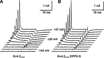 Figure 2. Ig from Kv4.2CTX and Kv4.2CTX:DPPX-S channels. (A) Ig from Kv4.2CTX channels expressed in tsA201 cells in the presence of 100 nM CTX and 105 mM intracellular CsF. From a holding potential of −153 mV, currents were elicited by a series of 12-ms voltage steps between −143 and +57 mV in 20-mV increments. (B) Ig from Kv4.2CTX:DPPX-S channels recorded under conditions identical to those used in A. Note the acceleration of the Ig-ON and Ig-OFF kinetics in the presence of DPPX-S.