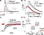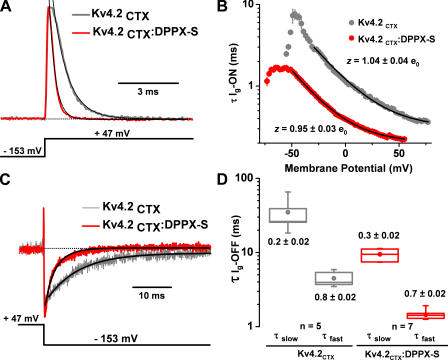 Figure 5. Kv4.2CTX Ig kinetics in the absence and presence of DPPX-S. (A) Ig elicited by a voltage step to +47 mV from a holding potential of −153 mV for both Kv4.2CTX (gray traces) and Kv4.2CTX:DPPX-S (red traces) channels. Note the accelerated decay of the Kv4.2CTX:DPPX-S Ig. Continuous black lines represent the best-fit exponential decays. The dotted line is the zero-current level. (B) Time constants resulting from the exponential fits plotted against membrane potential. The continuous black lines represent the best-fit exponential (see Materials and methods). Near the midpoint voltage of the QON-V relationships (data points excluded from the exponential fit), the Ig relaxations were described by assuming the sum of two exponential terms; thus, the corresponding data points are the weighted means of the time constants. Note that at all voltages, the Kv4.2CTX:DPPX-S Ig-ON exhibits faster time constants than its Kv4.2CTX counterparts. The effective valences derived from this analysis were 1.04 ± 0.04 e0 for Kv4.2CTX (n = 6) and 0.95 ± 0.03 e0 for Kv4.2CTX:DPPX-S (n = 7). (C) OFF Ig from both Kv4.2CTX (gray traces) and Kv4.2CTX:DPPX-S (red traces) channels resulting from a repolarizing voltage step from +47 mV to −153 mV. Continuous black lines represent the best-fit sum of two exponential terms. (D) Box plot of the Ig-OFF time constants (repolarizations to −153 mV from +47 mV). The borders of the boxes represent the 25th and 75th percentiles, whereas the median and mean are represented by a closed circle and a horizontal line in the box, respectively. Error bars represent the 5th and 95th percentiles, respectively. The fractional amplitudes of the exponential terms are indicated by the numbers displayed below or above the corresponding boxes.