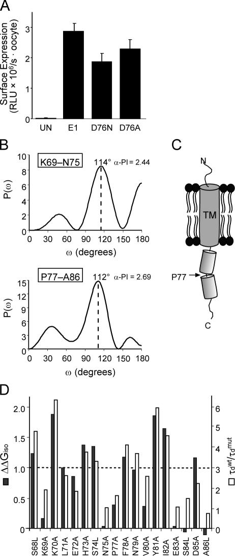 Type I transmembrane KCNE peptides contain a conserved C-terminal cytoplasmic domain that abuts the transmembrane segment. In KCNE1, this region is required for modulation of KCNQ1 K(+) channels to afford the slowly activating cardiac I(Ks) current. We utilized alanine/leucine scanning to determine whether this region possesses any secondary structure and to identify the KCNE1 residues that face the KCNQ1 channel complex. Helical periodicity analysis of the mutation-induced perturbations in voltage activation and deactivation kinetics of KCNQ1-KCNE1 complexes defined that the KCNE1 C terminus is alpha-helical when split in half at a conserved proline residue. This helical rendering assigns all known long QT mutations in the KCNE1 C-terminal domain as protein facing. The identification of a secondary structure within the KCNE1 C-terminal domain provides a structural scaffold to map protein-protein interactions with the pore-forming KCNQ1 subunit as well as the cytoplasmic regulatory proteins anchored to KCNQ1-KCNE complexes.