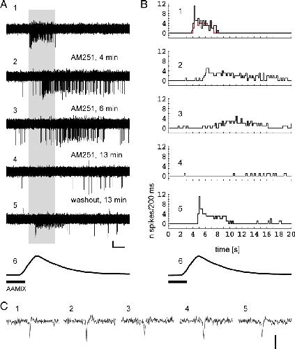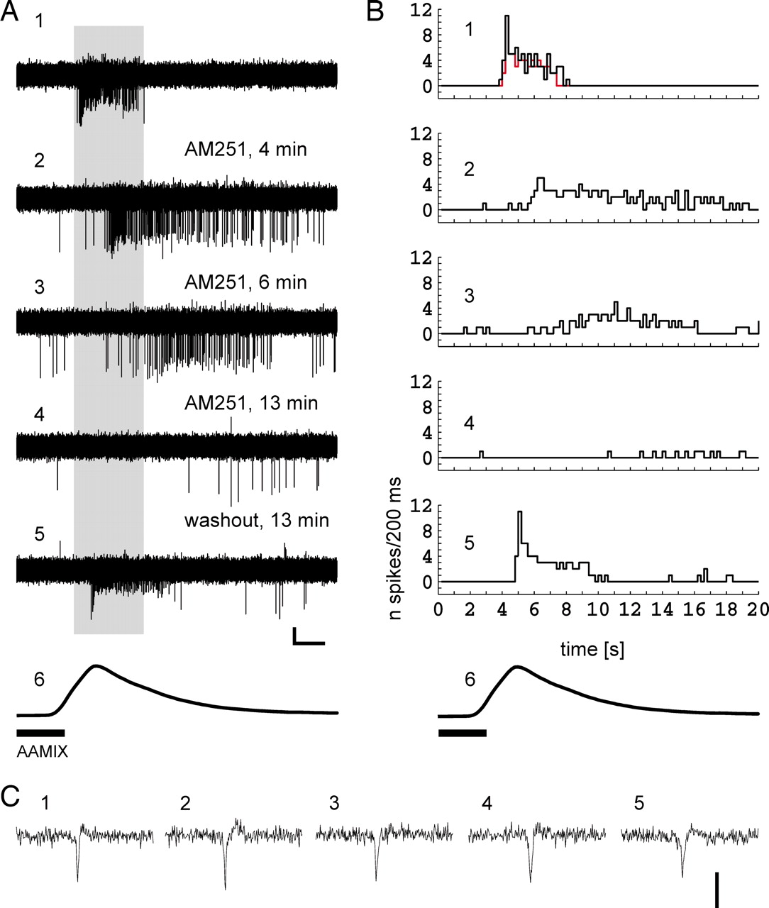 CB1 antagonist AM251 alters odor-evoked electrical activity in individual ORNs. (A1) AAMIX-induced action potential-associated currents of an individual ORN. [Scale bars: 2 s and 20 pA (A1âA5).] The corresponding poststimulus time histogram is shown in B1. The superimposed red histogram comes from a successive AAMIX application (interstimulus interval 3 min; current trace not shown) and shows the high reproducibility of the odorant response. (A2âA4 and B2âB4) The modulatory effect of AM251 on the action potential-associated currents depends on the wash-in time of the antagonist. (A5 and B5) Recovery after 20-min drug washout. The time window of the original response is indicated by the gray-shaded area. (A6 and B6) Odor concentration time course. Shown is simulation of the odor dynamics during a single odorant application (see Materials and Methods). (C1âC5) Zoom of individual spike-associated currents, one from each current trace A1âA5 (trace duration 25 ms). (Scale bar: 40 pA.)