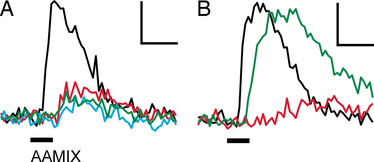 CB1 receptor-mediated antagonist action upon amino acid-sensitive ORNs. (A) The modulatory effects of AM281 (10 μM; red trace) on an AAMIX-evoked ORN response (black trace) could not be washed out within 2 or 5 min with bath solution alone (green trace and blue trace, respectively). (B) [Ca2+]i transient of an individual ORN upon application of the AAMIX (black trace). After addition of AM281 (10 μM) to the bath solution the AAMIX-evoked ORN response was suppressed (red trace). After 2 min of drug washout with HU210 (20 μM) in the bath solution, the odor-induced [Ca2+]i transient recovered almost completely (green trace). [Scale bars: 10 s and δF/F 50% (A) and 10 s and δF/F 100% (B).]