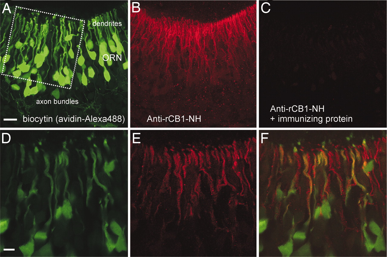 CB1 distribution in the OE of X. laevis tadpoles. (A) Slice of an OE with biocytin-avidin-stained ORNs (merged z-stack; 16 optical slices, total thickness 14.4 μm). (Scale bar: 20 μm.) (B) Immunoreactivity to an rCB1-NH antibody of the same slice (see Materials and Methods). (C) Merged z-stack of an OE treated with the anti-CB1 antibody after preadsorption with the immunizing protein (see Materials and Methods). (DâF) Higher magnification of the region indicated by the white rectangle in A (merged z-stack; four optical slices, total thickness 3.6 μm). (Scale bar: 10 μm.) (E) CB1-LI IR localized to dendritic processes. The somata of the ORNs are clearly IR-free. (F) Overlay of D and E. CB1-LI IR is clearly occurring at ORN dendrites.