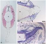 Fig. 1. Morphology of normal and regenerating tail of Xenopus tadpole. (A) Transverse section of a stage 50 tadpole tail was stained with hematoxylin and eosin. (B, C) Sagittal sections of the regenerating tail at days 2 and 3 after amputation. The pair of arrowheads indicates the amputation plane. Arrows in (B) indicate cell masses of the notochord precursor. The dorsal side is up and the anterior side is to the left in (B) and (C). N, notochord; SC, spinal cord; M, muscle mass. Scale bar, 50 μm.