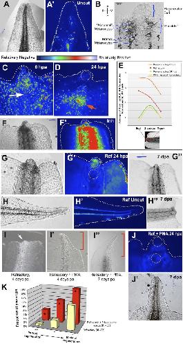 Fig. 3. Imaging of membrane voltage using DiBAC. Red indicates more depolarized than green, which is more depolarized than blue (see key under A'). For further description of the collection and analysis of the DiBAC data see Figs S1, S2 and S3 in the supplementary material. (A,A') An uncut tail from a st. 41-43 larva shows generally even voltage levels (blue areas), with scattered cells (green to red) that are depolarized relative to the rest of the tail. Scale bar: 250 ï°m. (B) Transmitted light image of a regenerating tail bud with the different regions labeled. The shoulder is defined as the region underlying the abnormally shaped melanocytes; this region appears darker in lower magnification images (e.g. F). Scale bar: 80um. (C) Regenerating tail bud imaged at 6 hpa. At this early time point, the bud is depolarized relative to the surrounding tissue. Yellow circles indicate bud and shoulder regions of interest (ROIs) that were used in quantifying this image (trunk ROI not shown on these cropped images). (D) Tail imaged at 24 hpa. The bud has repolarized relative to the 6 hpa state. The appearance of DiBAC fluorescence is similar to that in uncut tails, with the exception of the shoulder region that has an island of depolarization. Although not visible in every tail, this was a very common pattern. Yellow circles indicate ROIs; arrow indicates the depolarized region of shoulder cells. (E) Comparison of the relative voltage patterns found in regenerating 24 hpa (green), regenerating 6 hpa (orange), refractory (red) and PMA-rescued refractory (yellow) tails. Both regenerating 24 hpa and PMA-rescued refractory tails are depolarized in the shoulder region relative to the bud and trunk. By contrast, refractory and 6 hpa tails are highly depolarized in the bud, becoming more polarized in anterior regions. (F,F') Tail cut at st. 41 and treated with concanamycin. The large region of red and green indicates relatively strong depolarization, as predicted (V-ATPase polarizes, therefore the inhibitor should cause depolarization). (G,G') At 24 hpa, the buds of refractory tails are depolarized relative to a regenerating tail. Yellow circles indicate ROIs. (G") The same tail shown in G and Gconfirming that refractory tails fail to regenerate, even at 7 dpa. Scale bar: 250um. (H,H') Uncut st. 46-47 (refractory) tail. DiBAC images of refractory tails vary; in this image, dorsal and ventral blood vessels are obvious. The most consistent difference between refractory and regeneration-competent tails is the relatively even staining across the refractory tail (compare with the 'spottiness' of staining in A' and D). (H") The same tail as H and H' shown at 7 dpa, confirming that this tail was refractory when it was amputated. Scale bar: 250um.