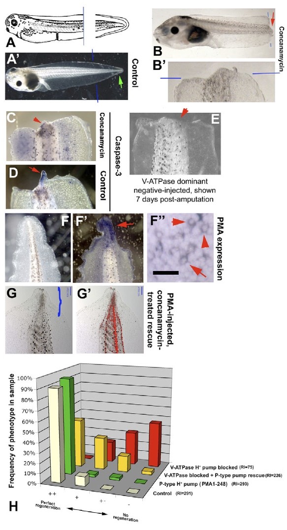 Fig. 1. The V-ATPase is required for tail regeneration in Xenopus. When amputated at st. 41 (A), the Xenopus laevis larva (n>1000) rapidly rebuilds a tail (A). Regeneration, but not anterior development, primary tail growth or wound healing, is abolished by specific inhibition of the V-ATPase H+ pump (n=226) by concanamycin treatment immediately after cutting (B; close-up shown in B). Blue lines in A-B' indicate approximate amputation plane. This inhibition of regeneration is not due to an upregulation of apoptosis, as concanamycin-treated tails (C) do not show a greater degree of staining for the apoptosis marker activated Caspase-3 than controls (D) when processed at 48 hpa. When the dominant-negative V-ATPase E subunit is expressed in tails, regeneration is not observed (E, compare with B', n=66), while otherwise normal development continues. For statistical analyses, see Table S2 in the supplementary material. (F-H) We attempted to rescue the V-ATPase-inhibited phenotype with misexpression of a single-subunit concanamycin-insensitive H+ pump, PMA. (F-F") Immunohistochemistry with antibody to PMA. Larvae were microinjected with PMA construct+GFP at the 1-cell stage, and sorted at tailbud or later stages for GFP expression in the tail. (F) Negative control larva injected with gal and probed with PMA antibody, showing no signal.