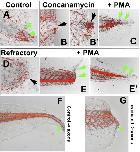 Fig. 5. Axonal growth pattern is dependent on H+ fluxes. Green arrows indicate normal axon patterning; black arrows indicate abnormal axon number and/or location. (A) The normal pattern of regenerating axons is parallel to the main body axis, extending to the tip of the bud at 72 hpa. This is altered in V-ATPase-inhibited tails, where axons are absent from the central core of the new tissue of partial regenerates at 72 hpa (B), or are present in a tangled mass and not aligned parallel to the tail primary axis (B'). The expression of the concanamycin-insensitive yeast PMA H+ pump in the tail can rescue the normal axonal patterning (C). (D) In refractory-stage larvae, axons terminate in a loop at a considerable distance from the edge, and perpendicular to the main tail axis. Expression of PMA rescues the neuronal phenotype, resulting in axon growth to the very edge of the wound in non-regenerating tails (E), and parallel outgrowth of axons into the new tissue of regenerates (E'). The normal pattern of axons, reaching to the end of the tissue at 7 dpa (F), is not affected by irradiation (G), which abolishes cell proliferation and regeneration; axons reach to the distal edge of the irradiated tissue. Tails shown in A-E are 72 hpa; those in F-G are 7 dpa. |