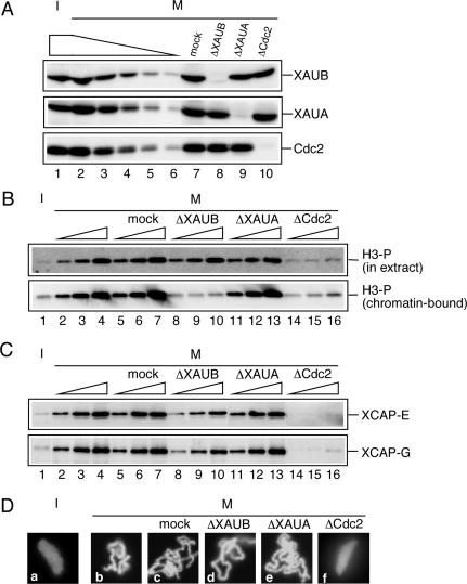 Figure 1. Effect of Aurora-B depletion on condensin I binding to chromosomes. (A) Mitotic extracts were depleted with control IgG (lane 7), anti-Aurora B (lane 8), anti-Aurora A (lane 9) and anti-Cdc2 (lane 10). Two microliter aliquots of each extract were analyzed by immunoblotting with the indicated antibodies. To estimate the efficiency of depletion, 2 μl (lane 1) of interphase extract, 2 μl (lane 2), 1 μl (lane 3), 0.5 μl (lane 4), 0.25 μl (lane 5) and 0.12 μl (lane 6) of mitotic extract were loaded in parallel (lanes 7–10). (B) Sperm nuclei were incubated with interphase extract (lane 1), mitotic extract (lanes 2–4), mock-depleted mitotic extract (lanes 5–7), Aurora B-depleted mitotic extract (lanes 8–10), Aurora A-depleted mitotic extract (lanes 11–13), or Cdc2-depleted mitotic extract (lanes 14–16). Assembled chromatin and chromosomes were isolated through a sucrose cushion, and 12.5% (lanes 2, 5, 8, 11 and 14), 25% (lanes 3, 6, 9, 12 and 15) and 50% (lanes 1, 4, 7, 10, 13 and 16) were separated by SDS-PAGE, and then detected by immunoblotting using anti-phospho H3 antibody (chromatin-bound; lower). To test the phosphorylation level in the extracts, 1 μl (lanes 2, 5, 8, 11 and 14), 2 μl (lanes 3, 6, 9, 12 and 15) and 4 μl (lanes 1, 4, 7, 10, 13 and 16) of the extracts were immunoblotted with anti-phospho H3 antibody (in extract; upper). (C) Chromatin-bound proteins were prepared the same as (B), and were separated by SDS-PAGE and immunoblotted by anti-XCAP-E (upper) or anti-XCAP-G antibodies (lower). (D) Sperm chromatin was incubated in interphase (a), mitotic (b), mock-depleted mitotic (c), Aurora B-depleted mitotic (d), Aurora A-depleted mitotic (e) or Cdc2-depleted mitotic (f) extracts at 22°C for 2 h, fixed, and then stained with Hoechst. |