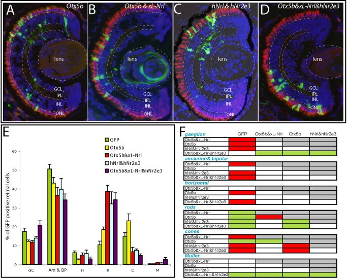 Nr2e3 and Nrl can reprogram retinal precursors to the rod fate in Xenopus retina.