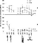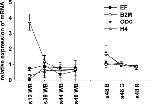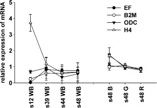 Relative mRNA expression of house-keeping genes, elongation factor-1α (EF), β-2-microglobulin (B2M), ornithine decarboxylase (ODC) and histone 4 (H4), in X. laevis tadpoles are shown during the first analyzed developmental stages according to Nieuwkoop and Faber (1994) from stage 12 to 48 of whole body homogenates (WB). Additionally, at stage 48 tadpoles were dissected in brain (B), gonads (G) and remaining tissue (R) and the mRNA expression was analyzed. Differences in EF and H4 mRNA expression were significant (p < 0.05) in the developmental period between stages 12 and 48, and therefore B2M was chosen as house-keeping gene for this period being more constantly expressed than ODC.