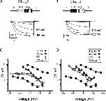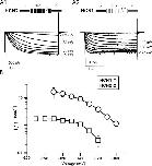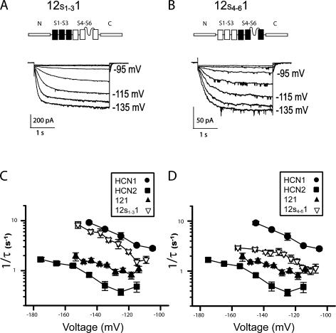 Figure 5. Effect on opening kinetics of replacing the S1–S3 or S4–S6 transmembrane subdomains of HCN1 with corresponding regions of HCN2. (A) Currents elicited by hyperpolarizing steps for chimera in which the S1–S3 region of HCN1 was replaced with the corresponding region of HCN2 (chimera 12S1-31). (B) Currents elicited by hyperpolarizing steps for chimera in which the S4–S6 region of HCN1 was replaced with the corresponding region of HCN2 (chimera 12S4-61). (C) Relation between the rate of opening (1/τ) and test potential for the chimera 12S1-31 (inverted open triangles; n = 5). 1/τ values of HCN1 (filled circles), HCN2 (filled squares), and 121 (filled triangles) from Fig. 3 are also plotted for comparison. (D) Relation between the rate of opening (1/τ) and test potential for the chimera 12S4-61 (inverted open triangles; n = 13) and other constructs described above.