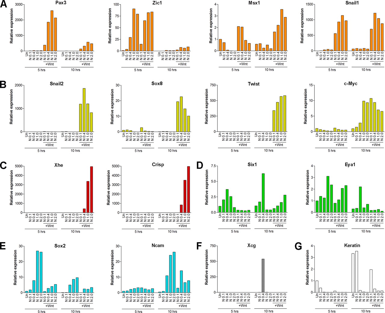 Regulation of NPB cell fates by Bmp attenuation and Wnt signaling. Embryos at the two-cell stage were injected in the animal pole with increasing doses of Noggin (N) mRNA (0.1, 0.4, 1.0, and 2.0 ng) alone or in combination with Wnt1 (+Wnt) mRNA (100 pg). Animal explants were dissected at the blastula stage, cultured for 5 or 10 h, and analyzed by real-time RT-PCR for the expression of four putative NPB specifiers, Pax3, Zic1, Msx1, and Snail1 (A), and a number of cell type-specific genes: Snail2, Sox8, Twist, and cMyc for NC (B); Xhe and Crisp for HG (C); Six1 and Eya1 for PE (D); Sox2 and Ncam for neural plate (E); Xcg for cement gland (F); and Keratin for epidermis (G). Un, uninjected animal explant. Each value was normalized to the level of EF1α expression. |