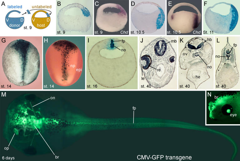 Figure 2. The BCNE Center Contributes to Forebrain and Midline Structures(A) Method used for lineage tracing of the BCNE center with biotin-dextran amine (BDA) labeled grafts.(B) Sagittal section of a recently grafted BCNE at stage 9.(C) Chd mRNA expression at stage 9.(D) BCNE descendants at stage 10.5.(E) Chd mRNA expression at stage 10.5.(F) BCNE center descendants at stage 11.(G) Dorsal view of BCNE descendants at neural plate stage 14.(H) Double staining of transplanted BCNE region with nuclear lacZ mRNA and epidermal ectoderm of the host with epidermal cytokeratin (epi) probe in light red at stage 14.(I) Transverse section at the level of the trunk at stage 16. Abbreviations: fp, floor plate; no, notochord.(J–L) Transverse sections at stage 40. Abbreviations: fp, floor plate; hb, hindbrain; he, heart; le, lens; mb, midbrain; no, notochord; ov, otic vesicle; re, retina.(M) Dorsal view of 6-d embryo transplanted with a BCNE graft from CMV-GFP transgenic embryos. Abbreviations: br, brain; fp, floor plate; on, optic nerve; op, olfactory placode.(N) Side view at 4 d showing labeled retina and brain. Abbreviation: br, brain. |