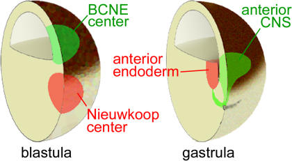Figure 8. Double-Assurance Model for Brain Formation by the BCNE and Nieuwkoop CentersBlastula Chd- and Nog-expressing cells are located in the dorsal animal region, while the Nieuwkoop center is found in the dorsal-vegetal region. At gastrula, the anterior endoderm derived from the Nieuwkoop center is found in close apposition to the prospective anterior CNS. See text for discussion. |