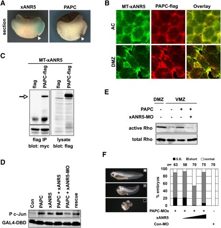 Figure 4. xANR5 Is Physically Associated with PAPC and Indispensable for the PAPC-Dependent Signaling Pathway(A) Expression patterns of xANR5 and PAPC at the early gastrula were detected with Fluorescein-labeled antisense RNA of xANR5 and DIG-labeled antisense RNA of PAPC. Embryos were fixed at stage 10.5 and sectioned sagittally through the dorsal midline. xANR5 and PAPC were showed overlapping expressions at the DMZ. Arrowheads indicate the blastopore.(B) Full-length xANR5 was tagged with the 6-repeat myc epitope (MT-xANR5), and full-length PAPC was tagged with the flag epitope (PAPC-flag). MT-xANR5 (50 pg) and PAPC-flag (50 pg) were injected into two animal and dorsal blastomeres at the 2-cell stage and 4-cell stage and then isolated at the blastula and early gastrula stage, respectively. xANR5 was detected with a mouse anti-myc antibody and an Alexa 488-conjugated mouse anti-IgG antibody. PAPC was detected with a rabbit anti-flag antibody and an Alexa 544-conjugated rabbit anti-IgG antibody. Scale bar represents 50 μm.(C) Immunoprecipitation experiments with MT-xANR5 and PAPC-flag were carried out in 293T culture cells. The expressed proteins were precipitated with a mouse anti-flag antibody (Sigma-Aldrich) and detected with a rabbit anti-flag antibody (Sigma-Aldrich) and mouse anti-myc antibody. A physical interaction between xANR5 and PAPC was determined by western blotting. An arrow indicates PAPC expression detected with a rabbit anti-flag antibody.(D) A JNK activation assay was carried out with animal blastomeres. The single injection of PAPC or xANR5 enabled the induction of c-jun phosphorylation, and the coinjection of PAPC and xANR5 further increased the c-jun activity. The phosphorylation of c-jun triggered by PAPC overexpression was significantly decreased when xANR5-MO was coinjected, and this effect was rescued by xANR5 coinjection.(E) To investigate whether xANR5 is involved in the PAPC-dependent Rho activation, a Rho activation assay was carried out with marginal zone explants. In the VMZ, the overexpression of PAPC induced the activation of Rho activity, which was suppressed by the coinjection of xANR5-MO.(F) The depletion of PAPC by MO injection into the 2 dorsal blastomeres at the 4-cell stage resulted in a short trunk and S.B. Coinjection of xANR5 mRNA into the dorsal cells could partially rescue the effect of PAPC-MOs.