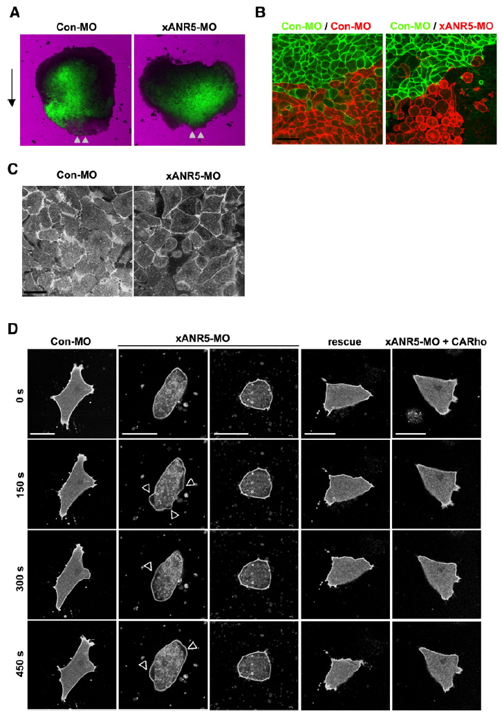 Figure S3. Loss of xANR5 Function Caused a Cell-Adhesion Defect (A) DMZs from embryos that had received either Con-MO or xANR5-MO with Vns mRNA microinjection were observed at stage 14. The Con-MO-injected DMZ underwent convergent extension and showed extensive cell migration. In contrast, the xANR5-MOinjected DMZ remained thick and short, and the MO-introduced cells failed to move. Arrow indicates the direction of mesendoderm migration. Arrowheads indicate the leading edge. (B) Each side of a dorsal cell from an embryo that had received a microinjection of mbVns and mbRFP with MO at the 4-cell stage. The DMZ was isolated at stage 10.5, then cultured on a fibronectin-coated dish. At stage 13, xANR5-MO caused loose coordination among the cells, which were round in shape; in contrast, the cells from Con-MO-injected embryos were well packed. (C) Cell-protrusive morphology in the DMZ from embryos that had received an injection of mbVns and xANR5-MO showed a dramatic loss of protrusions. Some cells appeared to have lost their ability to interact with the cell matrix and had detached from it. Cells from Con-MO-injected embryos developed active cell protrusions. (D) To observe dynamic changes in the protrusive morphology in a single cell, we took a time-lapse movie at 150 s intervals. The cells from Con-MO-injected embryos produced dynamic filopodia and lamellipodia. In contrast, xANR5-MO-introduced cells showed dramatically fewer and smaller active protrusions, which were static on the fibronectin. xANR5-MO-injected cells showed membrane blebs that moved rapidly within the cell membrane. The coinjection of xANR5 or CARho could restore the effect caused by the loss of xANR5 function, and resulted in dynamic protrusions. Arrowheads indicate membrane blebs. Scale bars represent 50 mm.