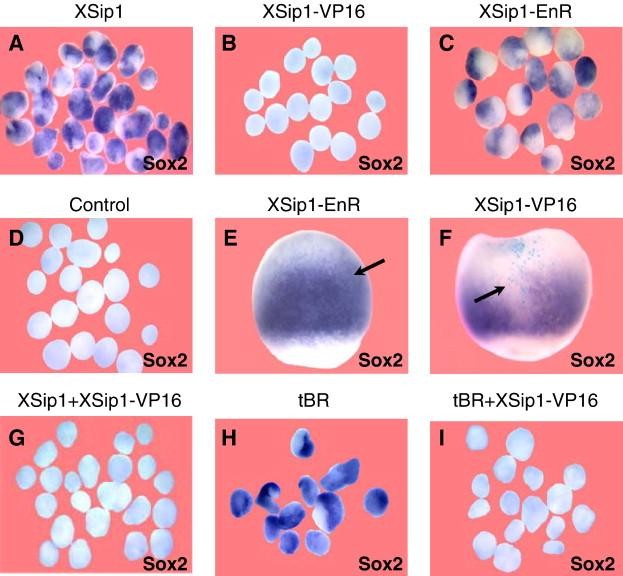 Fig. 1. XSip1 acts as a repressor during neural differentiation of the ectoderm. Whole-mount in situ analysis of Sox2 expression in embryos (St. 11) or animal caps (St. 14). Embryos were injected at the four-cell stage with the indicated RNA. (AâD) Injection of 250 pg of XSip1-VP16, in contrast to wild-type XSip1 and XSip1-EnR, does not induce Sox2 in animal caps. (E, F) Embryos injected with 250 pg of XSip1-VP16 or XSip1-EnR RNA. LacZ RNA was co-injected and X-gal staining was performed to reveal distribution of the injected RNA. Note the expansion of Sox2 expression on the injected area in the XSip1-EnR injected embryo (arrow) and the reduction in the XSip1-VP16 injected embryo. (GâI) Animal caps derived from embryos co-injected with 50 pg of XSip1 RNA or 200 pg tBR RNA together with 250 pg of XSip1-VP16 RNA. XSip1-VP16 prevents induction by XSip1 or tBR of Sox2. Respective inductions (A) 100%, n = 28; (B) 0%, n = 29; (C) 90%, n = 30; (D) 0%, n = 44; (E) 80% embryos with expanded Sox2, n = 18; (F) 100% embryos with downregulation of Sox2, n = 40; (G) 0%, n = 35; (H) 100%, n = 26; (I) 0%, n = 35. |