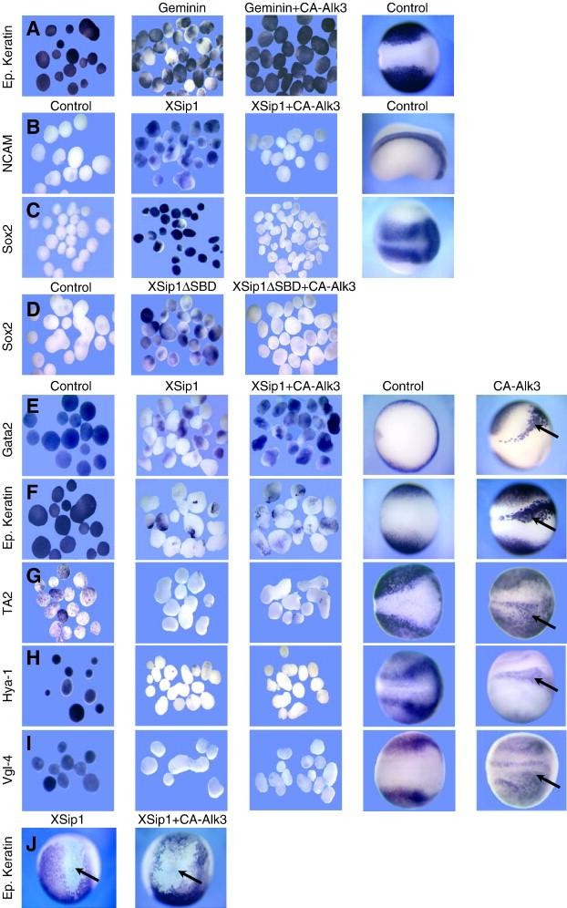 Fig. 2. Effect of BMP signaling on XSip1 activity. (AâI) Animal caps derived from embryos injected at the four cell-stage (250 pg/blastomere) with Geminin RNA (A), XSip1 RNA (B, C, EâI) or XSip1δSBD mRNA (D) with or without CA-Alk3 RNA (100 pg) analyzed at neurula stage by in situ hybridization with the indicated probes. For each marker, control non-injected animal caps are shown on the left. Non-injected control embryos and CA-Alk3 RNA-injected (100 pg) embryos at neurula stage (dorsal view, anterior right) are shown on the right. Note that CA-Alk3 blocks XSip1's ability to induce the neuronal markers Sox2 and NCAM (B and C) and the repression of Gata2 expression (E). In contrast, CA-Alk3 does not affect XSip1's ability to block several other epidermal genes like epidermal keratin, TA-2, Hya-1 and Vgl-4 (EâI). (J) Lateral views of embryos injected with XSip1 RNA alone or together with CA-Alk3 RNA and stained for epidermal keratin. Co-expression of CA-Alk3 does not affect XSip1 repression of epidermal keratin. Respective inductions/inhibitions in â+CA-Alk3 caps and embryosâ: (A) all positive, n = 35; (B) all inhibited, n = 18; (C) all inhibited, n = 52; (D) all inhibited, n = 36; (E) none inhibited, n = 40; (F) all inhibited, n = 22; (G) all inhibited, n = 25; (H) all inhibited, n = 28; (J) all inhibited, n = 33. Arrows in panels EâJ indicate the injected area. |