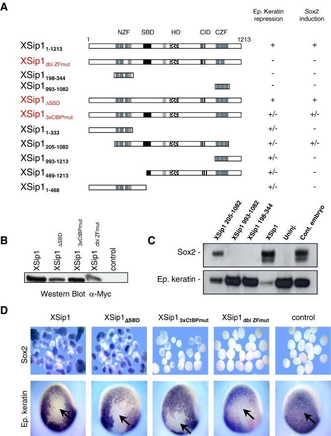 Fig. 4. Mutational analysis of XSip1 reveals multiple regions, including the CtBP interaction domain, involved in XSip1 repression activity. (A) Schematic representation of XSip1 wild-type protein and mutants used in this study. The amino-terminal and carboxy-terminal zinc finger domains (NZF and CZF; gray boxes), Smad-binding domain (SBD; black box), homeodomain-like domain (HD; dotted box), C3H type zinc finger (light gray boxes) and the CtBP interacting domain (CID: black stripes) are shown. Embryos injected unilaterally at the two-cell stage (250 pg) overproducing wild-type XSip1 or mutants were tested at neurula stage by in situ hybridization for epidermal keratin expression. For animal cap assays, embryos were injected at the four-cell stage in each cell (250 pg/blastomere). Animal caps were analyzed at neurula stage by in situ hybridization or RNase protection for Ep. keratin and Sox2 expression. The ability of the different XSip1 mutants to block Ep. keratin expression and to induce Sox2 was evaluated based on the RNase protection data: (+) fully active, (+/â) partially active, and (â) not active. A minimum of 30 embryos were used for each condition. Note that, with the exception of the XSip1dbl ZFmut, and NZF or CZF alone mutants, all mutants are active, fully or partially, in the epidermal keratin repression assay. In contrast, in the Sox2 induction assay, only the XSip1 wild-type and XSip1δSBD polypeptides are fully active. Only two other mutants show some Sox2 induction activity, XSip1205â1082 and XSip1CtBPmut. (B) Control Western blot with extracts prepared from injected animal caps overproducing Myc-tagged XSip1 wild-type and several mutant proteins. (C) RNAase protection analysis of Sox2 and Ep. keratin expression in animal caps derived from embryos overeproducing wild-type and several XSip1 mutants. Note that, compared to the wild-type protein, XSip1205â1082 shows reduced Sox2 induction and Ep. keratin repression activity. XSip1198â344 and XSip1993â1082 mutants corresponding to the first and second zinc finger domains alone are not active. (D) In situ hybridization analysis of Sox2 and Ep. keratin expression in animal caps (top panels) and embryos (bottom panels) that overproduce the indicated XSip1 proteins. Embryos are viewed laterally. Note that, in contrast to XSip1δSBD, which functions as the native XSip1 protein, XSip13xCtBPmut induced less efficiently Sox2 in animal caps and XSip1dbl ZFmut was inactive. Both XSip1δSBD and XSip13xCtBPmut, as judged by in situ hybridization, retain epidermal keratin repression activity. Arrows in panel D indicate the injected area. |