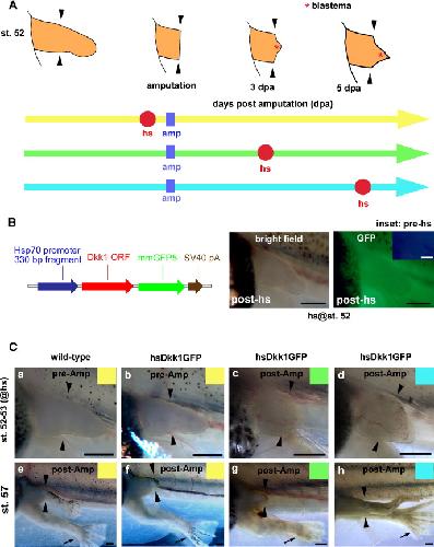 Fig. 2. Wnt/β-catenin signaling is required for Xenopus limb regeneration. (A) Experimental scheme. Hindlimb buds of F0 tadpoles were amputated at the presumptive knee level (amp: represented as blue square). One heat-shock (hs: represented as red circle) was applied to tadpoles at 3 to 4 h prior to amputation (yellow line), 3 dpa (days post amputation; green line) or 5 dpa (blue line). (B) Map of the heat-shock inducible Dkk1GFP transgene. Details are described in Materials and methods. Expression of Dkk1GFP was induced in a transgenic tadpole carrying this transgene within 3 to 4 h after heat-shock (left panel, bright field; right panel, GFP). No GFP expression was detected in the same tadpole before heat-shock (inset). (C) Live limb buds were photographed when tadpoles were heat-shocked (st. 52â53; aâd). The same amputated limb buds were photographed again when regenerated limbs became obvious in controls (st. 57; eâh). A wild-type tadpole heat-shocked prior to amputation regenerated the amputated limb bud completely (a and e). While the hsDkk1GFP tadpoles heat-shocked prior to amputation (b and f) or at 3 dpa (c and g) failed to regenerate, hsDkk1GFP tadpoles heat-shocked at 5 dpa regenerated incomplete hindlimbs (d and h). Note that un-amputated rightlimb buds developed normally (black arrows). Arrowheads show the presumptive knee level (amputation level). Scale bars: 500 μm.