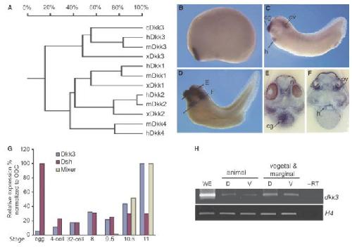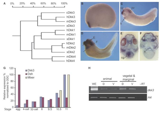 Fig. 1 Expression of dkk3 during Xenopus laevis development. (A) Dkk homology tree. Percent protein sequence homology is indicated on the top. (BâF) Whole-mount in situ hybridization of dkk3 during Xenopus development. (B) Neurula stage (stage 17), (C) taibud stage, and (D) tadpole stage. Anterior is to the left. (EâF) Sagittal sections through the regions indicated in (D). (G) Real-time RT-PCR analysis of the indicated genes in Xenopus development. (H) RT-PCR of the indicated genes in dissected Xenopus stage 8 blastulae (D, dorsal; V, ventral explants). cg, cement gland; h, heart; n, notochord; ov, otic vesicle.