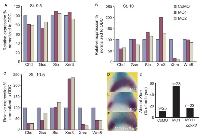 Fig. 3 Dkk3 is required for mesoderm induction. (AâC) Real-time RT-PCR analysis for the indicated marker genes of embryos injected at one- to two-cell stage with the indicated antisense Morpholinos. Embryos were analyzed at late blastula (A), early gastrula (B), or mid-gastrula stage (C). (DâF) Four-cell stage embryos were