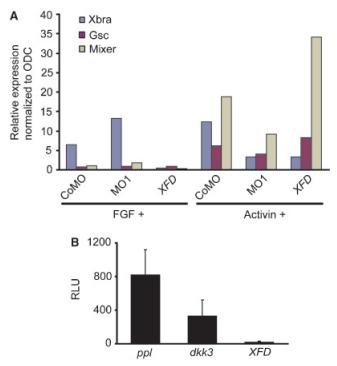analyzed by real-time RT-PCR. (B) Reporter construct for FGFERK (Gal-ELK:Gal-Luc) signaling was injected, together with either 2 ng ppl, 2 ng dkk3, or 1 ng XFD mRNAs into four-cell-stage embryos as indicated. Embryos were harvested at stage 10.5 and luciferase reporter activity was measured.