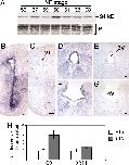 Fig. 1. Caspase-9 mRNA and activated caspase-9 increase in metamorphic tadpole brains. (A) Activation of C9 was monitored by Western blotting on brain extracts of tadpoles at different stages of metamorphosis, by using an active C9 specific antibody. The 34-kDa band, corresponding to conversion of pro-C9 to active C9, as predicted from cleavage sites in the procaspase sequences (17), is seen from stage NF55 (onset of metamorphosis) up to stage NF63 (end of metamorphosis), peaking at stage NF60 (climax of metamorphosis). The immunoblot was repeated by using independent samples. Equal amounts of proteins were loaded per lane and subsequently confirmed by Ponceau-S staining (P). (BâG) Spatial distribution of C9 mRNA in Xenopus brains at stage NF63 with ISH, by using an antisense digoxigenin-labeled probe on coronal sections (B, D, and F). Strong localized expression of C9 mRNA is seen in the ventricular zone of the anterior (B), medial (D), and posterior (F) brain. Control adjacent sections were hybridized with a sense probe (C, E, and G), showing no labeling. ISH was done twice on independent groups of tadpoles showing identical results. VL, 3V, and 4V: lateral, third, and fourth ventricles. (Scale bars: BâG, 50 μm.) (H) Quantitative-PCR analysis of C9 and XR11 expression after T3-treatment of perchlorated tadpoles. Fold inductions were normalized against untreated tadpoles. Statistical analysis for PCR data were done comparing the means of δCT values ± SD, by using Student's t test (n ⥠3): Differences were extremely significant for C9 (P < 0.001) and significant for XR11 (P < 0.05). |