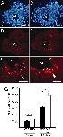 Fig. 3. DN9 expression increases active cell proliferation in the ventricular zone of transfected brain. SGT in brain was carried out at stage NF57 by using CMV-driven DN9-GFP or GFP constructs, and proliferation was compared between DN9 and controls at 3 and 15 days after transfection by using the PH3-antibody. (AâF) Mitotic cells were observed on para-sagittal sections at 15 days after transfection for control (B and magnification, C) and compared with DN9 (E and magnification, F), showing more proliferative cells in DN9-transfected brain. DAPI counterstaining shows the same anterior brain region compared with control (A) and DN9 transfections (D). Note at higher magnification the greater concentration of positive cells for DN9 (arrows) lining the ventricle. (G) PH3-positive cells were counted for the VL in the anterior brain, showing a strong increase in mitosis in brains transfected with DN9 vs. controls. Each experiment was repeated twice, giving similar results. Means ± SEM are given; n > 6 in each group; âââ, P < 0.001. (Scale bars: A-F, 100 μm.) |