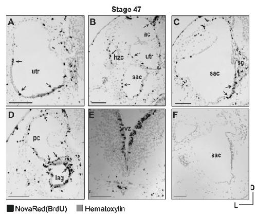 Fig. 2 (Left). Cell proliferation in nascent sensory compartments of the stage 47 X. laevis inner ear, three hours after transient exposure to BrdU. Anterior to posterior sections representing the entire inner ear (A-D) show the presence of BrdU-positive cells (deep black; arrows) in the epithelia of all endorgan compartments. (A) BrdU- positive cells are more prevalent in the ventral regions of the utricle in anterior sections. (B) BrdU-positive cells are distributed throughout the epithelium of the utricle, horizontal canal, sacculus and anterior canal. (C) BrdU incorporation was detected in the saccular sensory epithelium and in the sensory ganglion. (D) BrdU-positive cells are visible in the lagena and posterior canal in posterior sections of the inner ear. (E) BrdU-positive cells were detected in the ventricular zone of the brain. (F) Control section processed for immunohistochemistry with secondary antibody but without primary (anti-BrdU) antibody. Hematoxylin counterstain (grey). Scale bar, 100 μm.