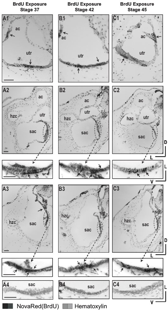 Fig. 3 (Right). Terminal mitosis in the inner ear of stage 47 X. laevis that were transiently exposed to BrdU at stages 37 (A), 42 (B) and 45 (C). Anterior to posterior sections representing the entire inner ear show the presence of BrdU-positive cells (black/dark-grey) with birthdates from earlier stages (S37, A1-A3; S42, B1-B3; S45, C1-C3) in stage 47 otic epithelia. Cells that had undergone terminal mitosis (arrows, dashed circles) are predominantly seen in the central regions of the emerging sensory epithelia of the utricle (A1, B1, C1) and of the sacculus (A2-A3, B2-B3, C2-C3) regardless of stage of BrdU exposure. Images of the saccular region within the dashed circles are shown at higher magnification underneath the corresponding panels. Control sections processed for immunohistochemistry with secondary antibody but without primary (anti-BrdU) antibody and counterstained with hematoxylin are shown in panels (A4, B4, C4) for the saccular epithelium. Hematoxylin counterstain (light grey). Scale bar, 50 μm.