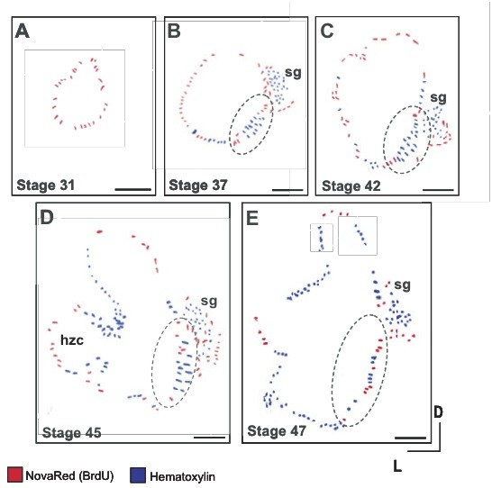 Fig. 5 (Right). Schematic diagrams illustrating cell production in sections of the stage 31 (A), 37 (B), 42 (C), 45 (D) and 47 (E) X. laevis inner ear that contain saccular epithelium (dashed circles) and the sensory ganglion (sg). (A) At early stages, BrdU-positive cells (red) are distributed throughout the entire epithelium of the stage 31 otic vesicle. (B-D) At stages 37 (A), 42 (B) and 45 (C), BrdU-positive cells are detected throughout the otic epithelium but appear restricted to specific regions such as the outer boundaries of the emerging saccular sensory epithelium and flanking the protrusions of the emerging horizontal canals (D). (E) In the stage 47 inner ear, BrdU-positive cells are distributed throughout the otic epithelium without a distinct trend toward localization in a particular region. Hematoxylin counterstain (blue). Scale bar, 100 μm.