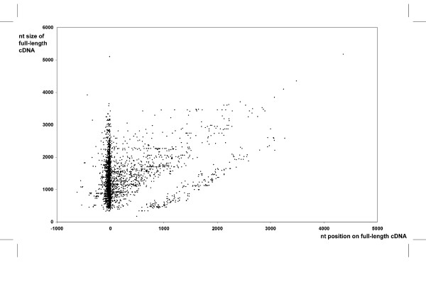 Figure 2. Added-value of xthr and xtbs 5'ESTs. 5' cDNA sequences were compared to 4,908 complete X. tropicalis cDNA sequences from XGC and Sanger Institute. When an EST matched unambiguously (>95% id over more than 50 nt on the same orientation) one of these cDNAs, the position of its first residue (X axis) was plotted as a function of the cDNA size (Y axis). Each dot represents the result of an alignment. A position of 0 on the x axis indicates identical 5' ends between the EST and cDNA. Negative values indicate that the EST extends further 5', positive values superior to the cDNA length indicate that the EST extends further 3', and positive values inferior to the cDNA size indicate the 5' EST position relative to the cDNA.