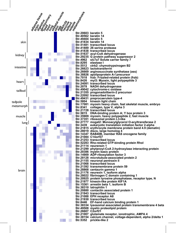 Figure 3. Digital expression profiles of X. tropicalis transcripts differentially expressed at metamorphosis. Each line gives the expression profile of a given transcript represented by a UniGene cluster. The expression is deduced from counting the occurence of ESTs derived from a given cDNA library. The level of expression is colour coded in blue shades, dark blue means evidence for high levels of transcripts and white means no evidence for expression. On the left, clusters of expression profiles are delineated by a vertical bar labelled with the associated characteristic domain of expression. On the right, the cluster name and its annotation (i.e. the corresponding gene product description as deduced from sequence similarity analysis) are given. Each column corresponds to a category of tissue or stage of development: 8 adult tissues and 6 stages of development. Note that a given category may correspond to several cDNA libraries. Here, only clusters for which evidence of differential expression were used to build the matrix of expression. This matrix was analysed by hierarchical clustering on the expression profile dimension using CLUSTER 3.0 as described in the methods section.